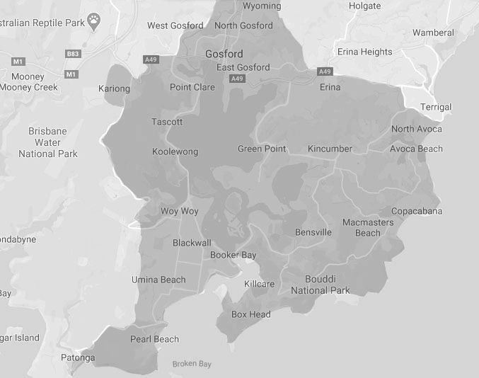 Central Coast, Ettalong, Patonga, Pearl Beach, Umina Beach, Booker Bay, Blackwall, Woy Woy, Daley's Point, St Hubert's Island, Kilcare, Empire Bay, Saratoga, Bensville, Macmasters Beach, Copacabana, Avoca Beach, Kariong, Erina, Kincumber, Green Point, Gosford, Wyoming, Point Clare, Tascott, Koolewong, Terrigal